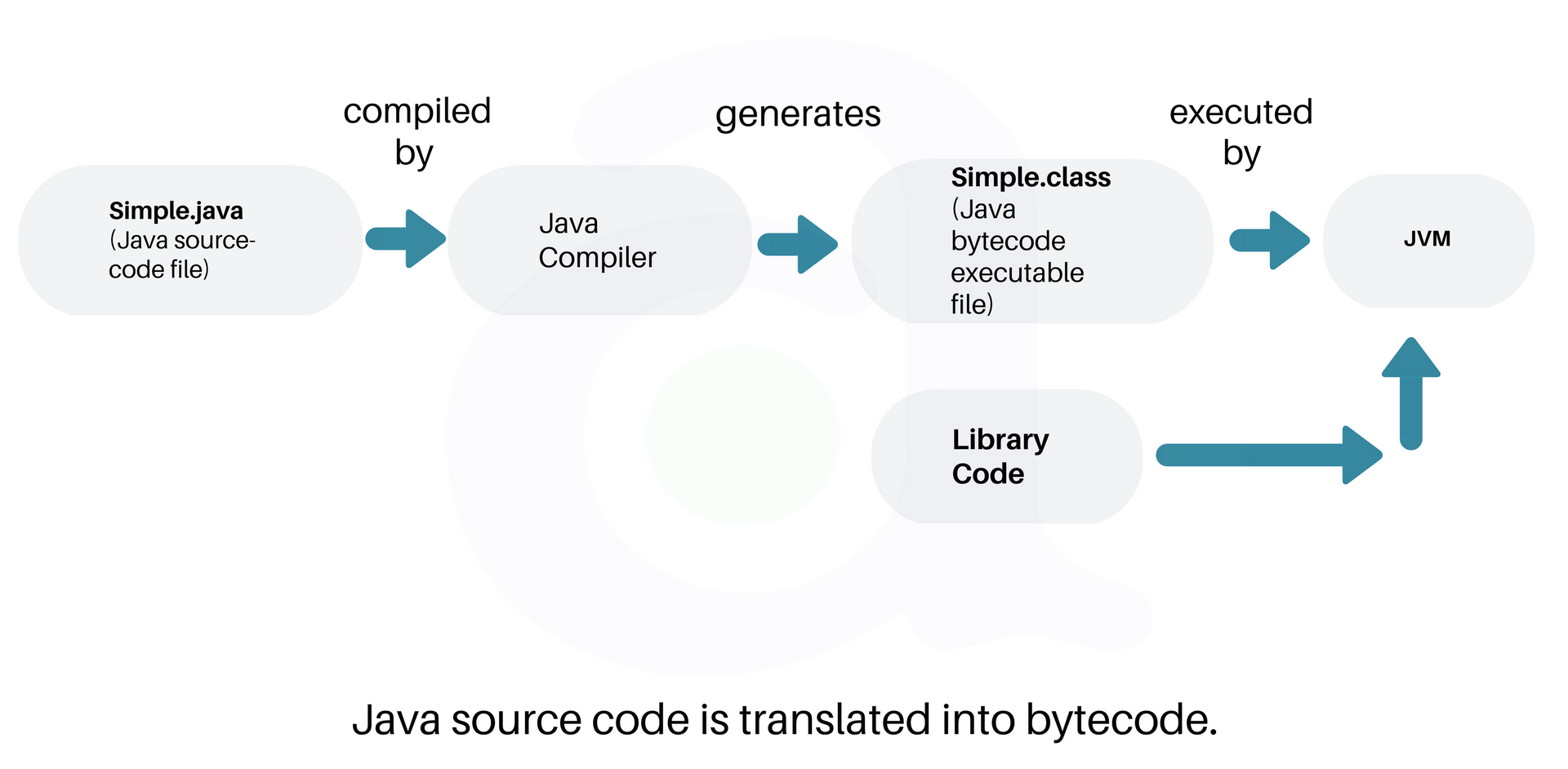 The Java language is a high-level language. All language compilers translate source code into machine code. Java compiler does the same thing.You save a Java program in a .java file and compile it into a .class file. The .class file (also called bytecode). Output of a Java compiler is not executable code. Rather, it is bytecode. Bytecode is a highly optimized set of instructions designed to be executed by the Java run-time system, which is called the Java Virtual Machine (JVM).The bytecode is similar to machine instructions but is architecture neutral and can run on any platform that has a Java Virtual Machine (JVM).The JVM executes our code along with the code in the library.
