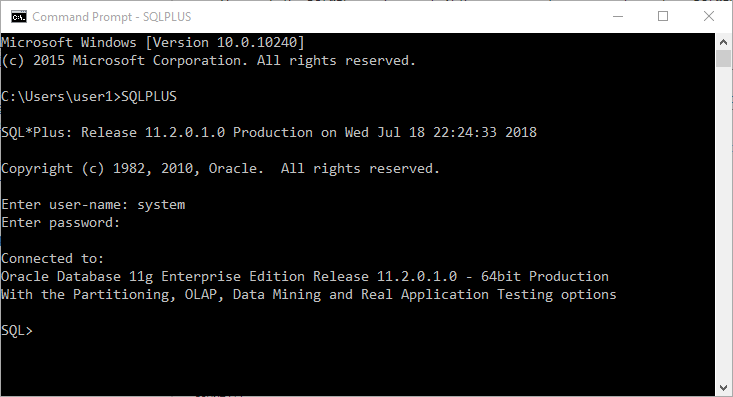 Microsoft Windows [Version 10.0.10240] (c) 2015 Microsoft Corporation. All rights reserved. C:\Users\user1>SQLPLUS SQL*Plus: Release 11.2.0.1.0 Production on Wed Jul 18 22:24:33 2018 Copyright (c) 1982, 2010, Oracle. All rights reserved. Enter user-name: system Enter password: alone#i#4 (For security, your password is not visible on your screen.) Connected to: Oracle Database 11g Enterprise Edition Release 11.2.0.1.0 - 64bit Production With the Partitioning, OLAP, Data Mining and Real Application Testing options SQL>