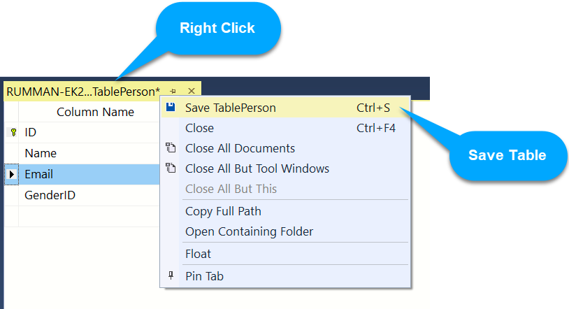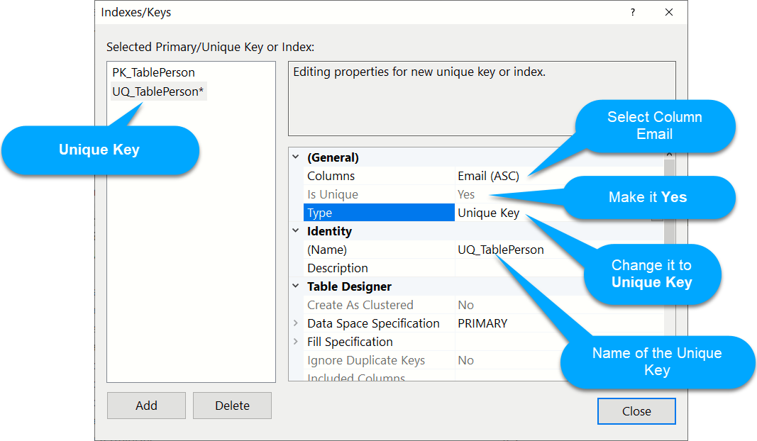 We use UNIQUE constraint to enforce uniqueness of a column i.e the column shouldn't allow any duplicate values. We can add a Unique constraint thru the designer or using a query.