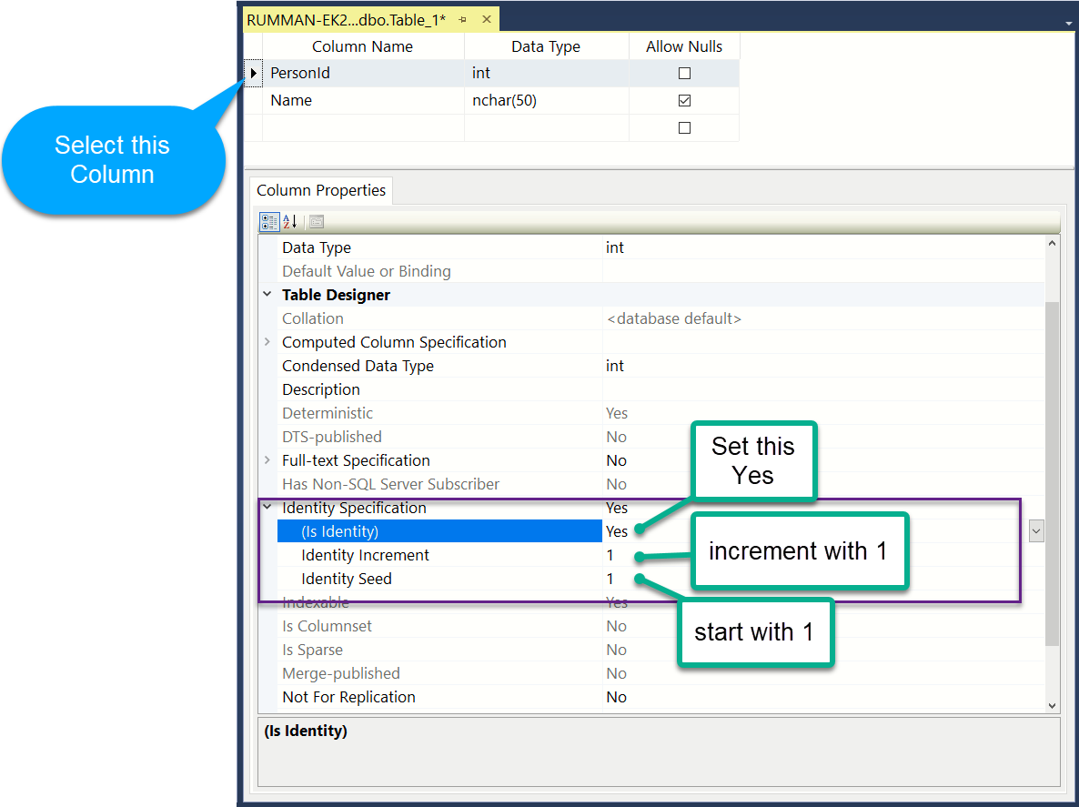 If a column is marked as an identity column, then the values for this column are automatically generated, when you insert a new row into the table. The following, create table statement marks PersonId as an identity column with seed = 1 and Identity Increment = 1. Seed and Increment values are optional. If you don't specify the identity and seed they both default to 1.