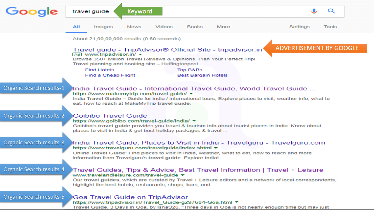 Basically when we search something on internet we take help of search engine like Google, Yahoo and Bing. But what search engine did for us? They have lots of search result according to our search query. That means they had been created a list before, which is called index. This list mainly create according to useful content & number of backlinks. If you got your web-page at first position on Google for any keyword, that means according to this keyword your web-page listed on first position of Indexing. Then what is keyword? If you type "TRAVEL GUIDE" on Google & click on the search button then "TRAVEL GUIDE" is keyword. We are going to discuss broadly about keyword later.