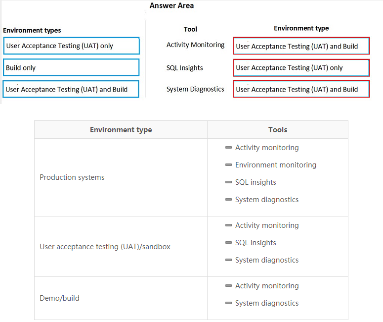 Which Lifecycle Services (LCS) tools should you use for each environment? To answer, drag the appropriate environment types to the correct tools. Each environment type may be used once, more than once, or not at all. You may need to drag the split bar between panes scroll to view content.