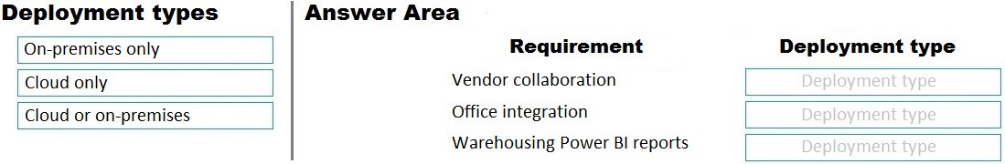 Which deployment type should you recommend? To answer, drag the appropriate deployment types to the correct requirements. Each deployment type may be used once, more than once, or not at all. You may need to drag the split bar between panes or scroll to view content.