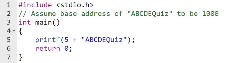 #include // Assume base address of "ABCDEQuiz" to be 1000 int main() { printf(5 + "ABCDEQuiz"); return 0; }